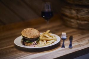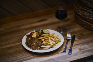 m/ salat, dressing, tyttebærrømme & pommes frites
