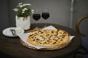 Kan få med marinert kylling, skinke, biff & skinke, biff & bacon, peperoni og elgkjøtt & bacon.
